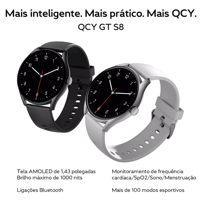 O Relógio Smartwatch QCY GT S8 é perfeito para quem busca inovação e praticidade no dia a dia. Com uma tela AMOLED de alta definição, oferece imagens nítidas e vibrantes. Sua conectividade Bluetooth permite receber chamadas e notificações diretamente no pulso.